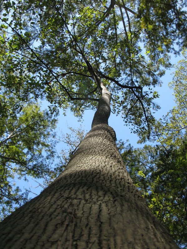 pion cypress, and it was the reason for my friend Brad and I to go there a few days ago. Cat Island is not on the way to anyplace. You don’t arrive there by accident. It has to be a destination all its own. Angola State Prison is the nearest location where there is an accumulation of human beings. So we went and drove the long gravel, bumpy roads to the place where the champion tree lives. You park near a gate that marks the trail leading ½ mile back into the forest. You begin the walk in an oak, hackberry, hickory forest and it is a pretty thing to see – big mature trees. About half way you begin to notice that the species are changing and evidence of flooding is visible from the cracks in the soil and the patches of drying duckweed that floated into the forest in this year’s high water. The duckweed looks out of place there on the bare, dry forest floor. As you look around you notice that the hardwoods have given way to the water trees. Cypress and tupelo gum now shades the path. You can’t help feel an excitement for what you anticipate lies at the end of the trail. And at the end of the walk you do find the tree for which the path was built, but there is a little bit of disappointment too. The base of the tree is huge, but not beautiful. It is a very large mass of living tree tissue, but not one that gives you the feeling of being in the presence of a tree that rises out of the earth to spread branches that soar. Perhaps it deserves the title of “cham